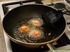 - Gently roll eggs in cornstarch to coat and shake off excess cornstarch. Dip into orange batter so they are fully covered. Poke eggs with the bamboo skewer and drop gently into the hot oil. Deep fry until the batter is crispy, about 2 minutes per side. Remove eggs with a slotted spoon and drain on paper towels.
