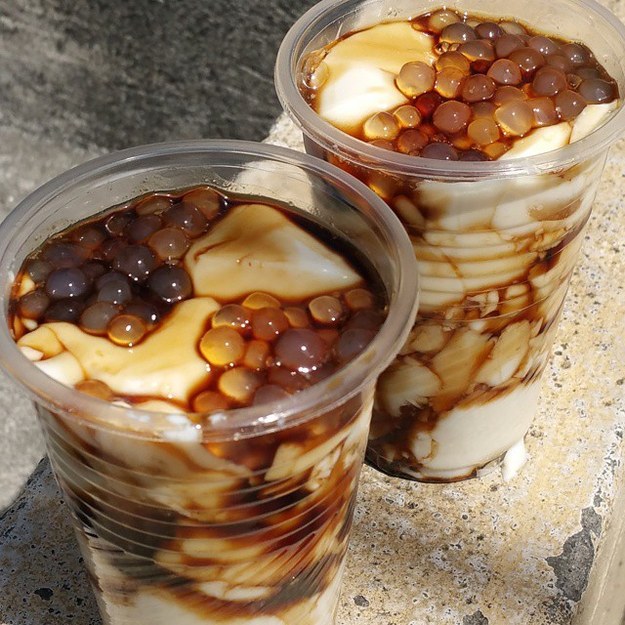 - Using a wide, flat serving spoon, divide tofu into serving bowls. Spoon sago and syrup on top. Serve warm.